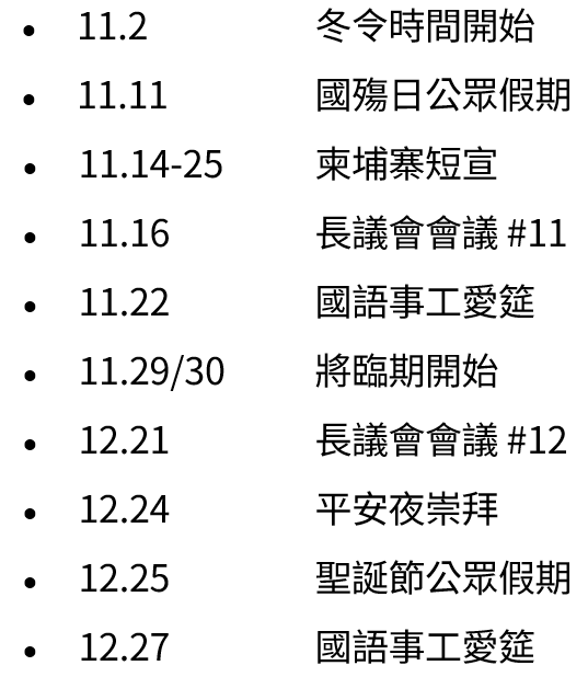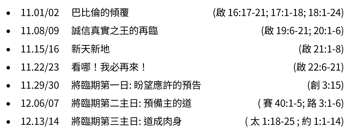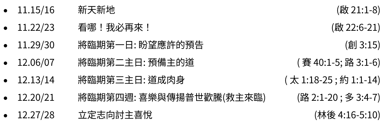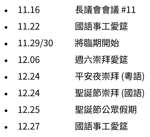 - 辦公室消息: 龔敏光牧師於11月30日至12月11日休假。