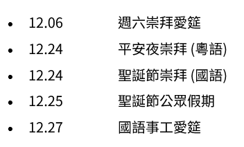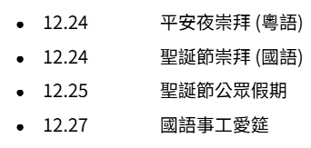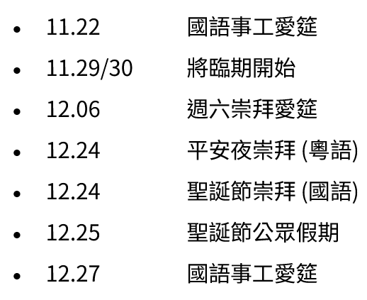 – 聖誕平安夜崇拜(粵語) 12月24日 晚上6點舉行。