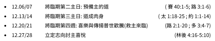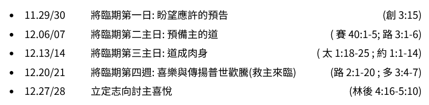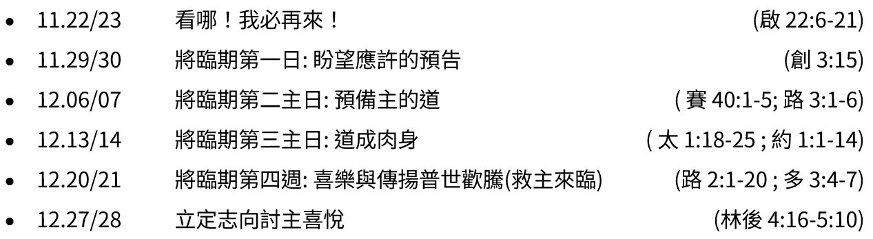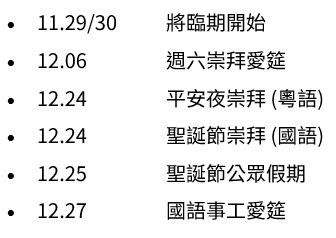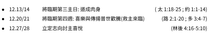 (二)透過本會奉獻轉交,請在奉獻封上註明:「華聯會-香港大埔」或 「CCACA-HK Taipo」。截止日期:12月21日。 - 聖誕節安排:將臨期已開始,教會在未來幾週的證道將會是以福音為主軸。鼓勵大家邀請未信主的朋友和親友參與。