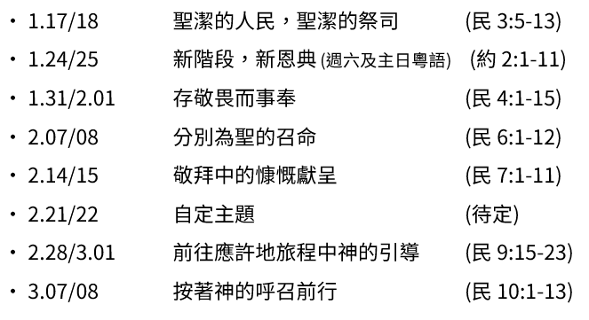 - 復活節浸禮:定於4月5日舉行,現正開始接受報名,截止日期是2月22日。申請受浸表格可於大堂接待處及辦公室索取。受浸者必須完成基要真理班課程。