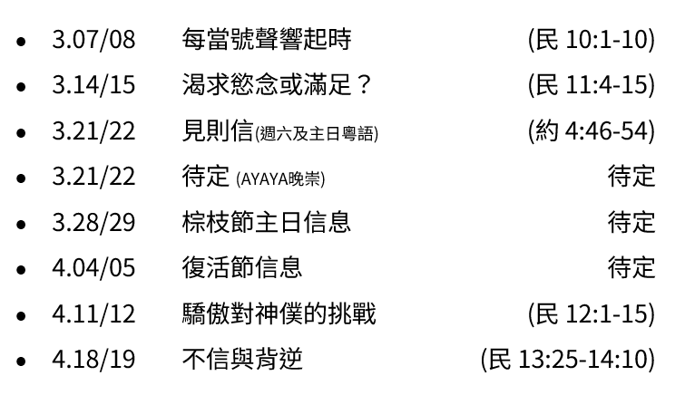 – 有興趣參加者,請於4月19日前填妥報名表格並交回教會辦公室(額滿即止)。 - 泰國短宣:凌善章長老及周力行牧師將於3月3日至15日前往泰國布吉進行短宣服侍。請在禱告中記念他們,求主下平安旅程,透過團隊祝福當地民眾。