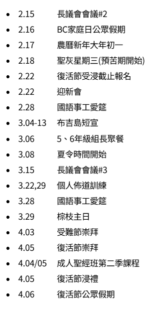 - 英語事工更新: 長議會決定終止英語事工牧師候選人的甄選程序。懇請大家為聘牧委員會禱告。
