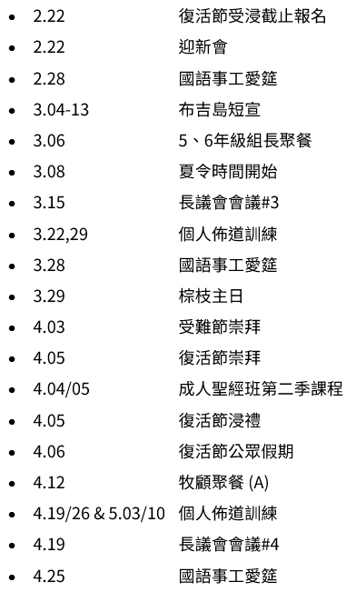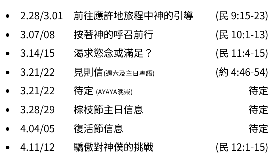 - 受難節崇拜:將於4月3日(星期五)舉行,崇拜將會以兩文三語同時進行,有兩個時段:下午 5 時或晚上 7 時,崇拜不設 ZOOM 連結。